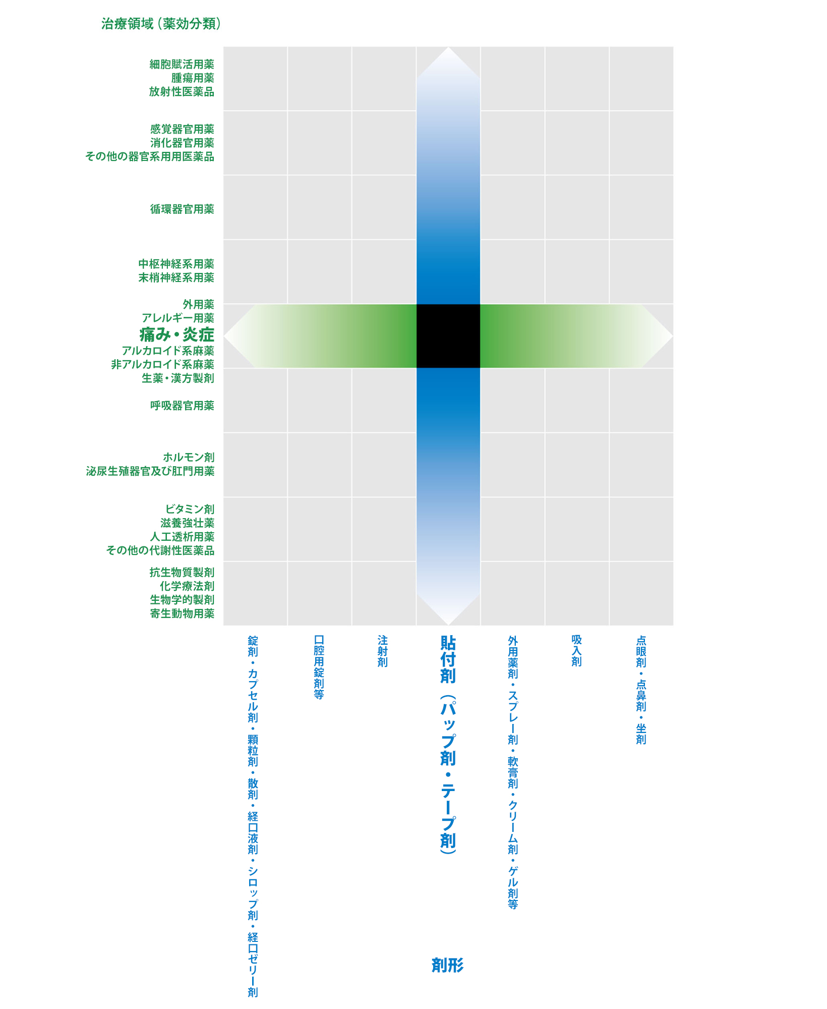 これまで長年にわたって培ってきた消炎鎮痛パップ剤の技術をもとに、ふたつの軸での展開をはかっています。