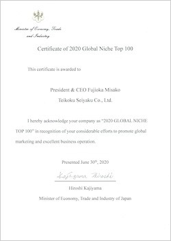 TEIKOKU SEIYAKU was selected as A Global Niche Top Company by METI in FY2020.